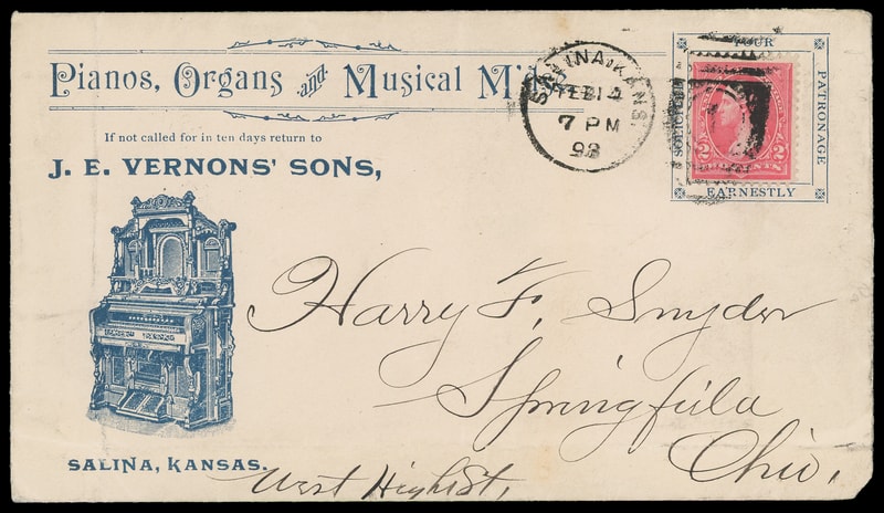 (Music) "Pianos, Organs and M'dse", JE Vernons Sons, Salina, Kansas, blue advertising collar with additional illustration at lower left on cover bearing 2¢ carmine (267) tied by "Salina Kans. Feb 14, 98" duplex to Springfield, Ohio, small corner nick anl light folds still, F.-V.F.