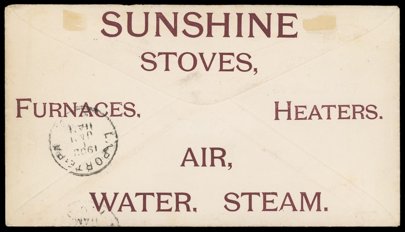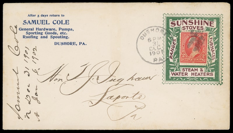 (Stoves) Sunshine Stoves Steam & Water Heaters, S. Cole, Dushore, Pa., brown and blue large advertising collar with additional brown advertising on reverse on cover bearing 2c Carmine (279B) tied by "Dushore, Pa Dec 31, 1901" duplex to LaPorte, Pa., vertical docketing at left well away from design, Very Fine.