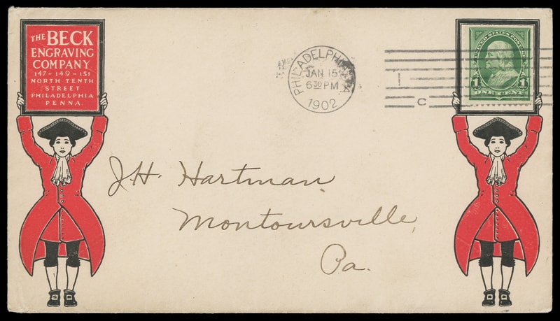 (Engraving) Beck Engraving Co, multicolored illustrated advertising with collar on cover bearing 1¢ green (279) tied by "Philadelphia, Pa Jan 15, 1902" machine cancel to Mountoursville Pa., Extremely Fine.