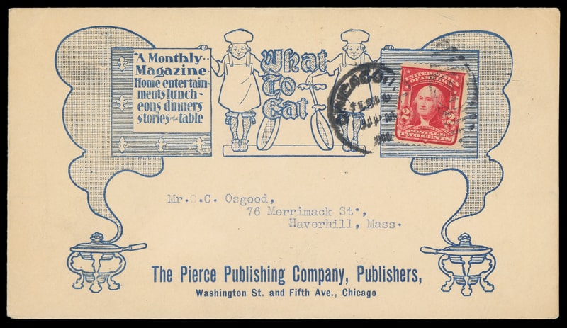 (Printing & Publishing) "What To Eat", Pierce Publishing Co., Chicago Ill., blue overall illustrated design incorporating stamp collar on cover bearing 2¢ carmine (319) tied by "Chicago, Ill. Feb 10, 1906" duplex to Haverhill Mass., Extremely Fine.
