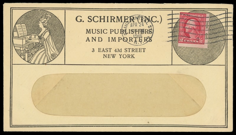 (Music) G. Schrimer Inc., New York N.Y., illustrated advertising incorporating stamp collar on cover bearing 2¢ Washington type I with Shermack perfs tied by "Grand Central Sta. Apr 24, 1916" machine cancel, Extremely Fine.