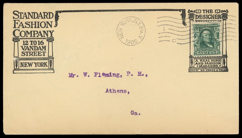 (Printing & Publishing) "The Designer", Standard Fashion Co., New York N.Y., illustrated advertising collar on amber cover bearing 1¢ green (300) tied by "New York N.Y. Sta V, 1906" machine cancel to Athens Ga., Extremely Fine.