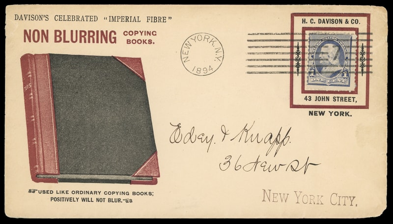 (Paper Supplies) "Non Blurring Copying Books", HC Davidson & Co, New York, multicolored illustrated advertising and stamp collar on cover bearing 1¢ dull blue (219) tied by "New York, N.Y. 1894" machine cancel to New York City, ever so slightly rounded corner still, Very Fine to Extremely Fine.