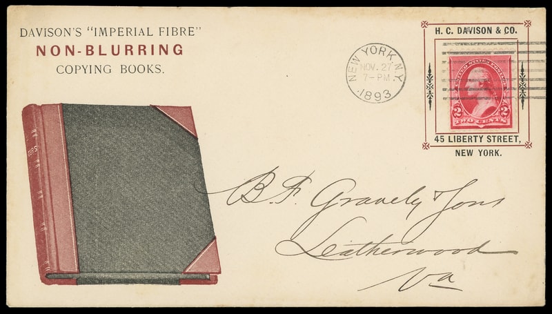 (Paper Supplies) "Non Blurring Copying Books" HC Davidson & Co, New York, multicolored illustrated advertising with stamp color on cover bearing 2¢ carmine (220) tied by "New York, N.Y. Nov 27, 1893" machine cancel to Leatherwood Va., Very Fine to Extremely Fine.
