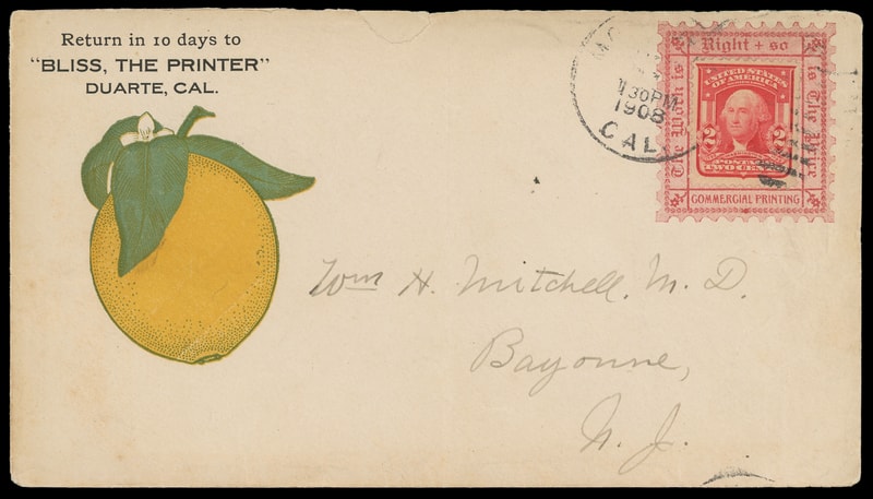 (Printing & Publishing) "The Work is Right - so is the Price", Bliss, The Printer, Duarte Cal., multicolored illustrated advertising with additional advertising stamp collar on cover bearing 2¢ carmine (319) tied by indistinct 1908 California duplex, cover with vertical fold and small piece out at top from opening still, Very Fine and colorful design.