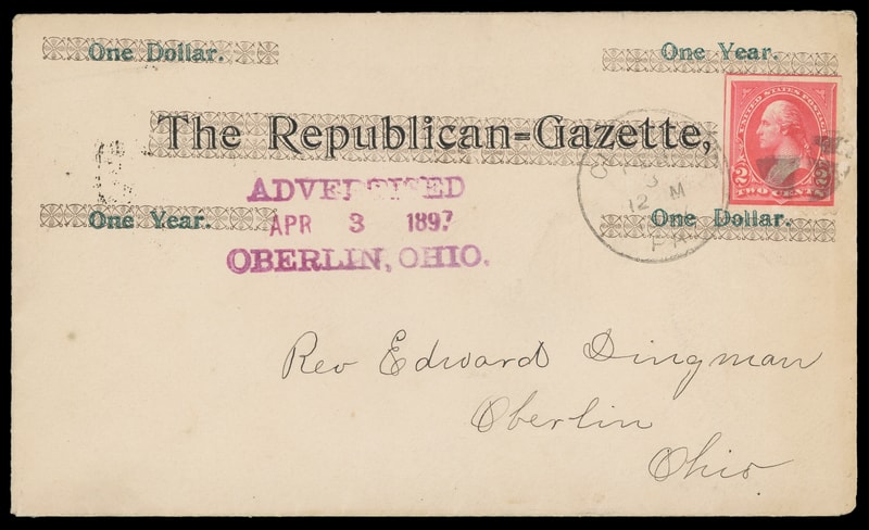 (Magazines) The Republican Gazette, green and black subscription advertising on cover bearing 2¢ carmine (267) tied by indistinct Pa. "Feb. 3, 1897" duplex to Oberlin O., additional three line magenta "Advertised Apr 3 1897 Oberlin Ohio" handstamp, various transit backstamps, Very Fine.