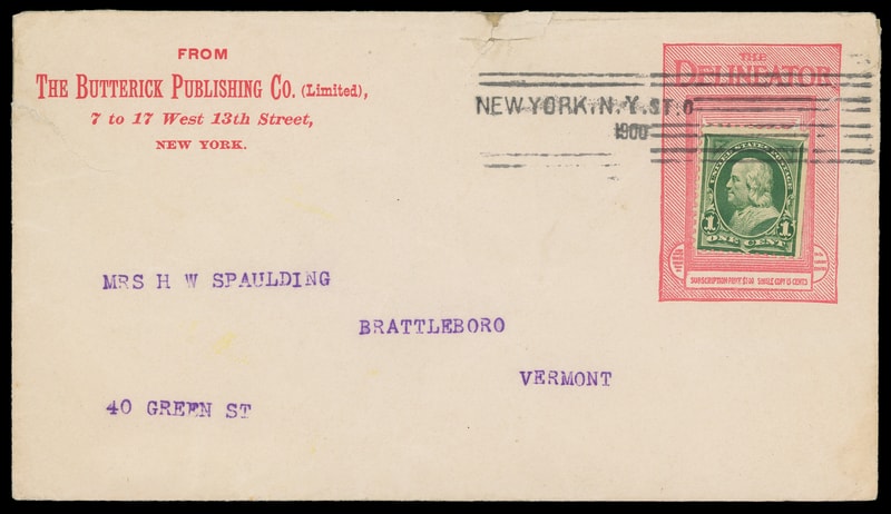 (Printing & Publishing) "The Delineator", Butterick Publishing Co, New York N.Y., red advertising collar on cover bearing 1¢ green (219) tied by "New York N.Y. St. O, 1900" machine cancel to Brattleboro Vt., small tear at top from opening still, Very Fine.