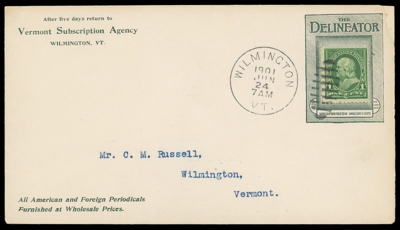 (Printing & Publishing) "The Delineator", Vermont Subscription Agency, Wilmington Vt., green advertising collar and printed cornercard with additional advertising on reverse on amber cover bearing 1c green (279) tied by … duplex to Wilmington Vt, Extremely Fine.