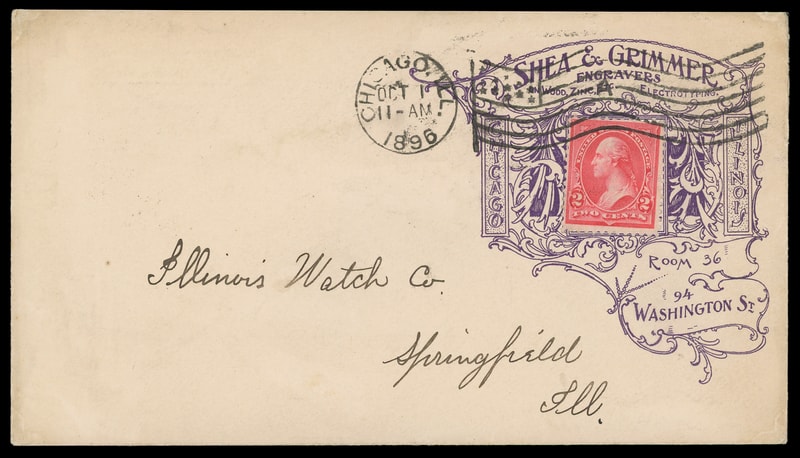 (Engravers) Shea & Grimmer, Chicago, Ill, purple ornate illustrated stamp collar on cover bearing 2¢ carmine (267) tied by "Chicago, Ill. Oct 1, 1896" machine cancel to Springfield Ill, Extremely Fine.