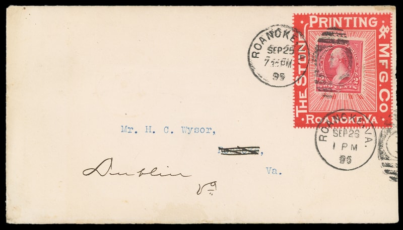 (Printing & Publishing) The Stone Printing & Mfg. Co., Roanoke Va., large red stamp collar on cover bearing 2¢ carmine (267) tied by "Roanoke Va. Sep 25, 1895" duplex to Dublin Va., Extremely Fine.