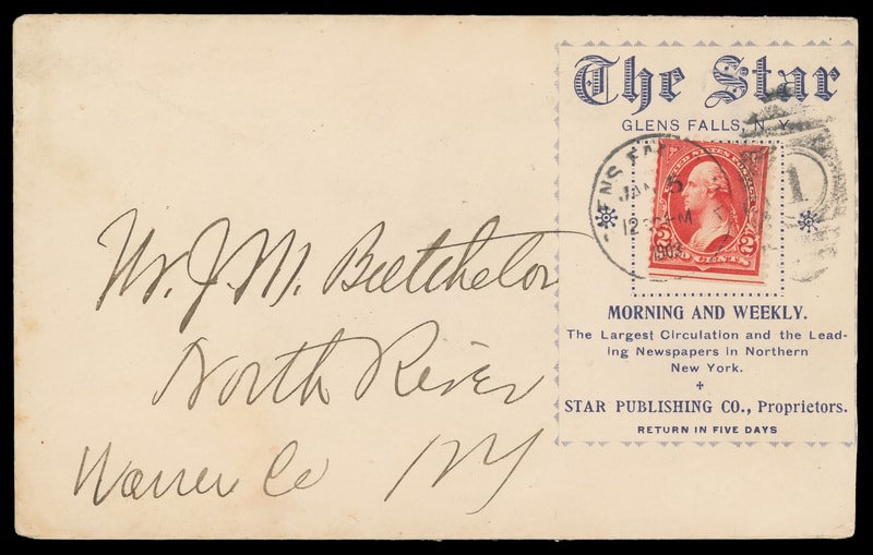 (Printing & Publishing) "The Star", Star Publishing Co, Glens Falls N.Y., large blue advertising collar on cover bearing 2¢ carmine (279B) tied by indistinct "Glens Falls N.Y. Jan 5, 1903" duplex to North River N.Y., slightly reduced at right still, Very Fine.