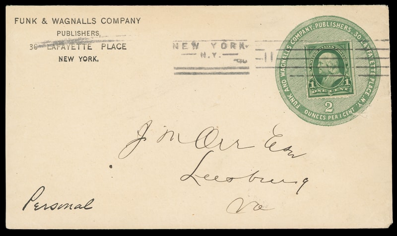 (Printing & Publishing) Funk and Wagnalls Publishers, New York N.Y., large green circular collar with integral 2 and "ounces per 1 cent" on cover bearing 1¢ green (279) tied by "New York, N.Y. '99" machine cancel to Leesburg Va., Oct. 19th 1899 arrival backstamp, Extremely Fine.