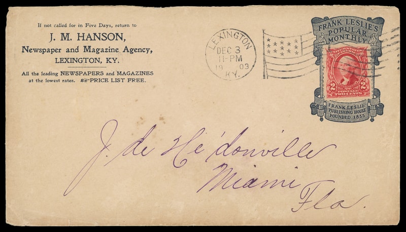 (Printing & Publishing) Frank Leslie's Popular Monthly, J.M. Hanson, Lexington Ky., ornate blue advertising collar on cover bearing 2¢ carmine (301) tied by "Lexington, Ky. Dec 3, 1903" flag cancel to Miami Fla., partial backflap with additional advertising still, F.-V.F.