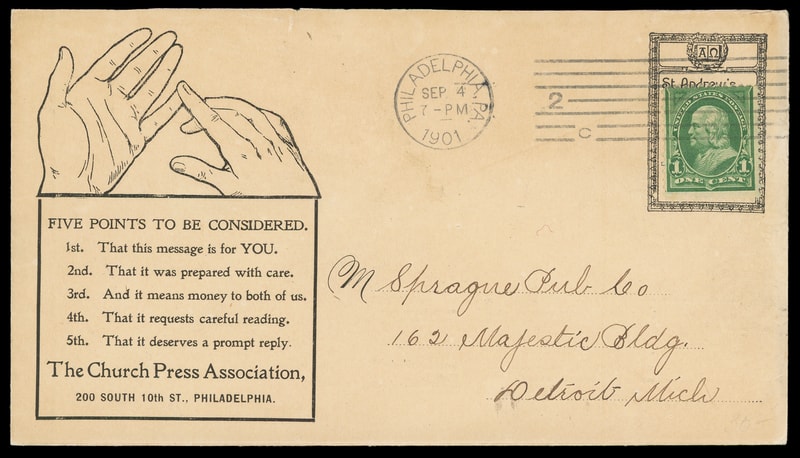 (Printing & Publishing) The Church Press Association, Philadelphia Pa., illustrated advertising with additional stamp collar on "Penny Saver" Patent envelope bearing 1¢ green (279) tied by "Philadelphia, Pa. Sep 4, 1901" machine cancel to Detroit Mich, unusual combination, Extremely Fine.