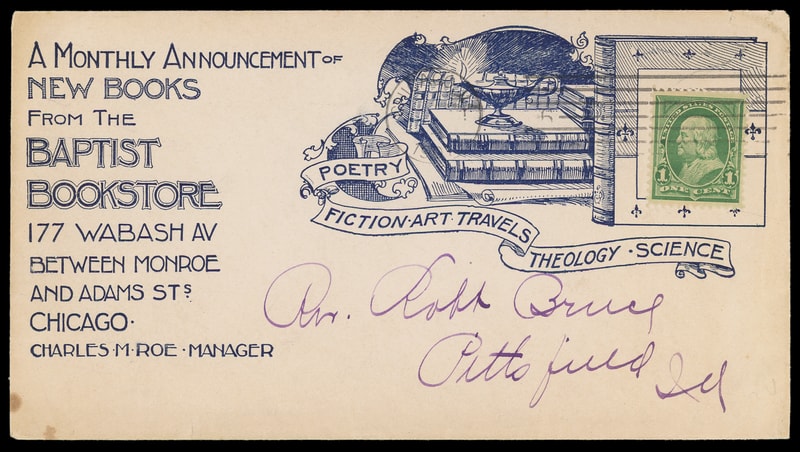 (Literature) "Baptist Bookstore" Chicago, Ill, blue illustrated advertising ornate collar on cover bearing 1¢ green (279) tied by "Chicago, Ill. 1901" machine cancel to Pittsfield Ind., attractive combination, trivial small corner stain lower left still, Extremely Fine.