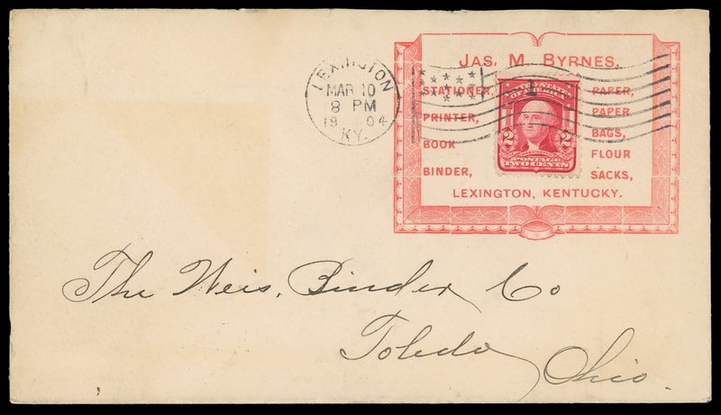 (Stationer) Jas. M. Byrnes, Lexington, Ky, red illustrated advertising collar on cover bearing 2¢ carmine (319) tied by "Lexington, Ky. Mar 10, 1904" flag machine cancel to Toledo, O., Extremely Fine.