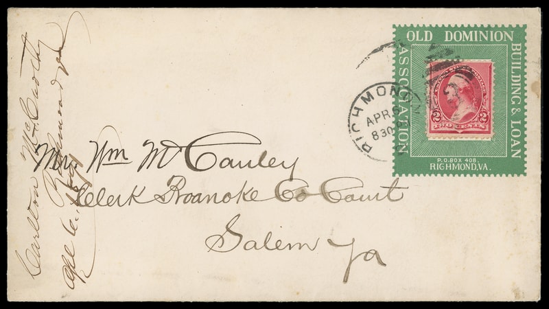 (Banking) "Old Dominion Building & Loan Association Richmond Va.", red stamp collar on cover bearing 2¢ carmine (220) tied by "Richmond, Va. Oct 20, 1892" duplex to Danville, Va., partial backflap still, Very Fine.
