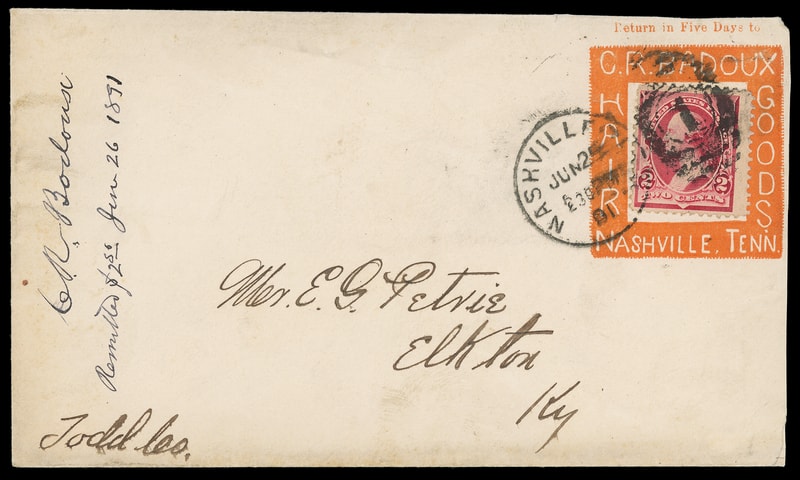 (Household Goods) "C.R. Badoux Hair Products, Nashville, Tenn", orange advertising collar on cover bearing 2¢ carmine (220) tied by "Nashville, Tenn. Jun 25, 1891" duplex to Elkton, Ky, bit reduced at right and vertical docketing at left otherwise, F.-V.F.