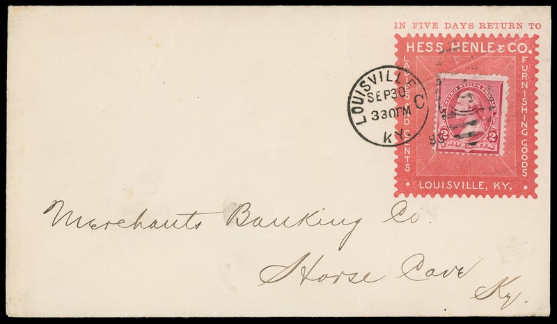 (Home Goods) Hesse Henle & Co, Louisville, Ky, large red stamp collar on cover bearing 2c carmine (220) tied by "Louisville, Ky. Sep 30, 1896" duplex to Horse Cave Ky, slightly reduced at right otherwise, Very Fine.
