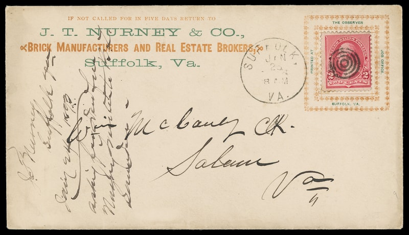 (Manufacturing) JT Nurney & Co "Brick Manufactures and Real Estate Brokers", Suffolk, Va., bi-colored stamp collar with advertising at left on cover bearing 2¢ carmine (220) canceled by small target duplexed with "Suffolk, Va. Jan 25, 1896" cds to Salem Va., docketing at left still, Very Fine.