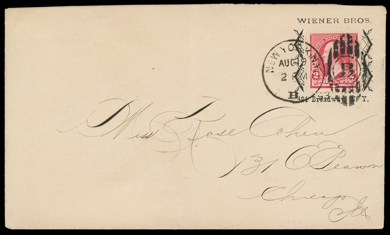(Merchant) Weiener Bros. 484 Broadway N.Y., unusual open collar (top and bottom) on cover bearing 2¢ carmine (220) tied by "New York, N.Y. Aug 19, 1893" duplex to Chicago Ill., unusual and interesting collar in need of further research, Very Fine.