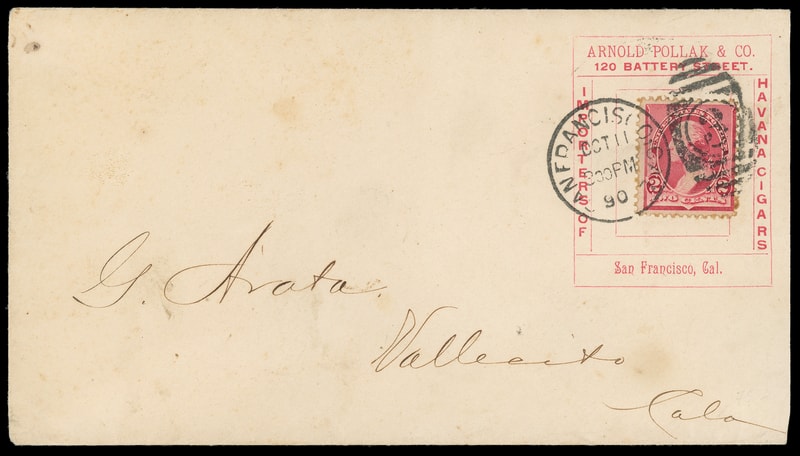 (Tobacco) Arnold Pollak & Co. "Importers of Havana Cigars" San Francisco, Cal.", large red collar on cover bearing 2¢ carmine (220) tied by "San Francisco, Cal. Oct 11, 1890" duplex to Vallicita Cal., F.-V.F. and scarce California ad collar.