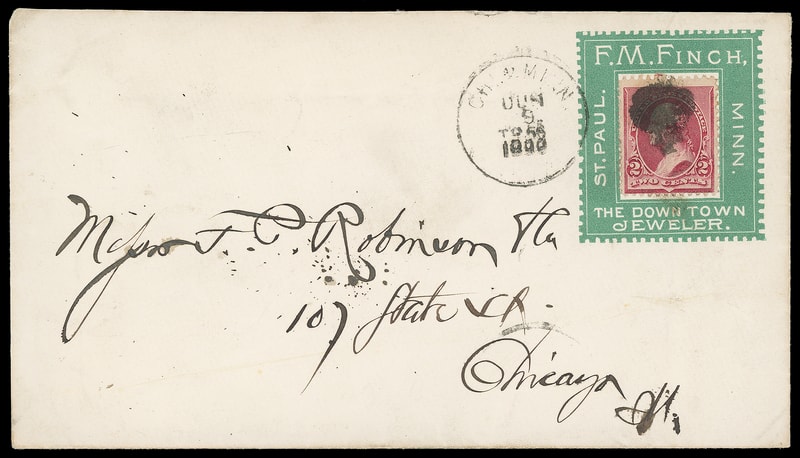 (Jewelry) "The Down Town Jeweler" F.M. Finch, St. Paul Minn, green advertising stamp collar on cover bearing 2¢ lake (219D) barely tied by cork cancel duplexed with "Chi. & Minn. R.P.O. Jun 9, 1900" railroad cds to Chicago Ill., Very Fine.