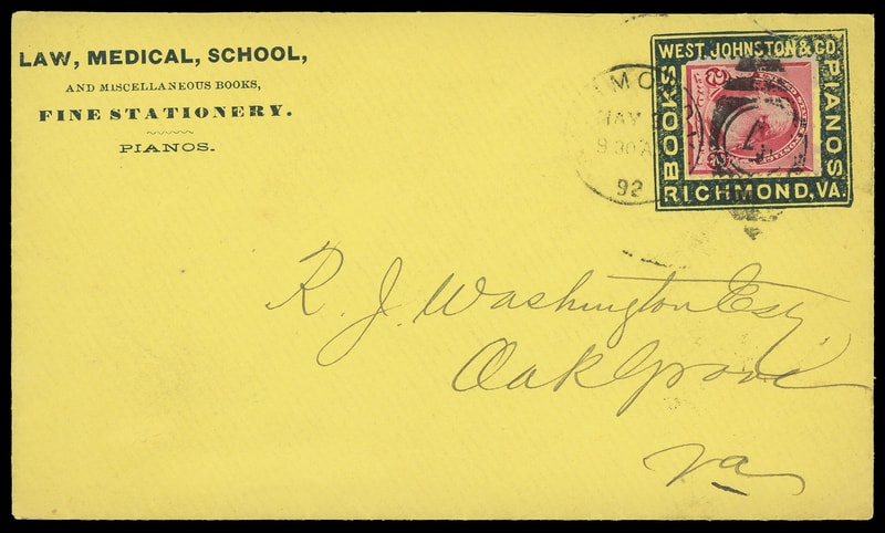 (General Merchandise) West, Johnston & Co, Books, Pianos, Richmond Va., blue stamp advertising collar on yellow cover bearing 2¢ carmine (220) tied by "Richmond Va. May 3, 92" duplex to Oak Grove Va., Very Fine and colorful.