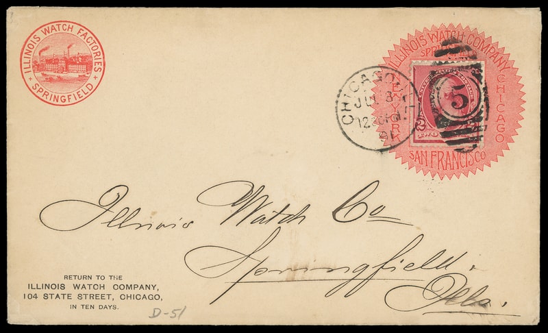 (Watches) Illinois Watch Company, Springfield Ill., ornate red circular advertising collar on cover bearing 2¢ carmine (220) tied by "Chicago, Ill. Jul 3, 1891" duplex to Springfield Ill., additional red circular illustrated corner card at left, Extremely Fine.