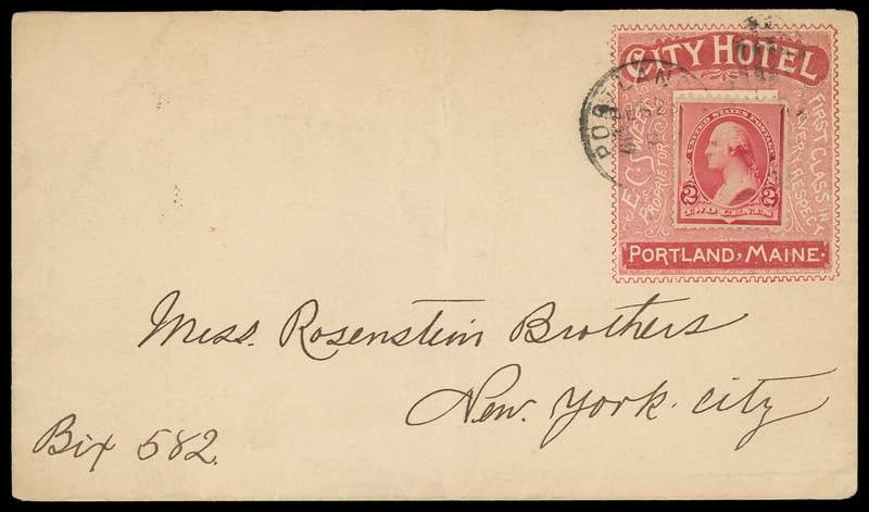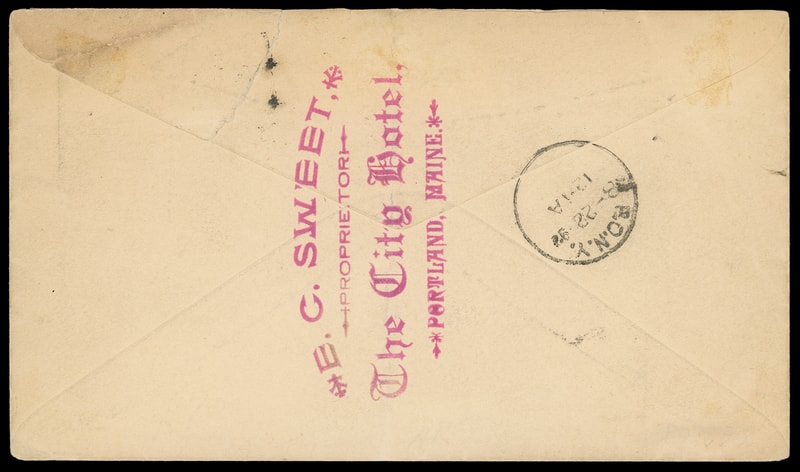 (Hotels) City Hotel, Portland, Maine, red illustrated advertising collar on cover bearing 2¢ carmine (220) tied by "Portland, Me. Aug 20, 1892" duplex to New York City, additional large magenta oval hotel backstamp "E.C. Sweet, Proprietor", Very Fine to Extremely Fine.