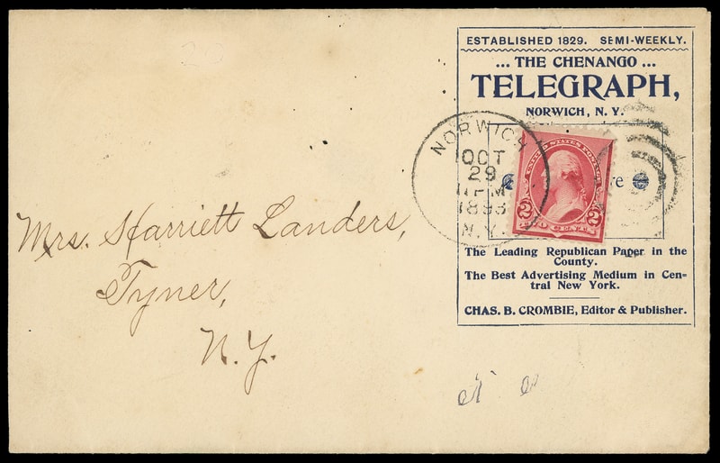 (Newspapers) "The Chenango Telegraph, Norwich, N.Y.", large advertising collar on cover bearing 2¢ carmine (220) tied by "Norwich, N.Y. Oct 29, 1893" duplex to Tyner N.Y., reduced at left, still Very Fine.