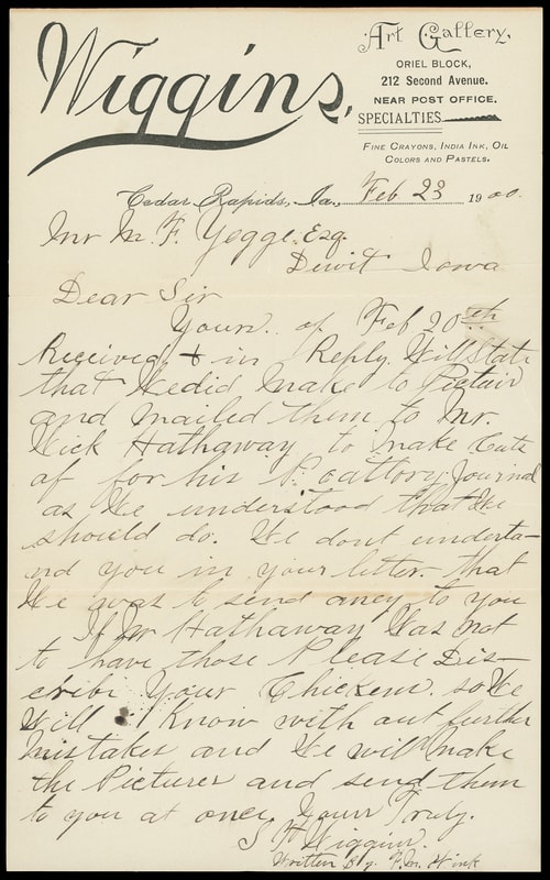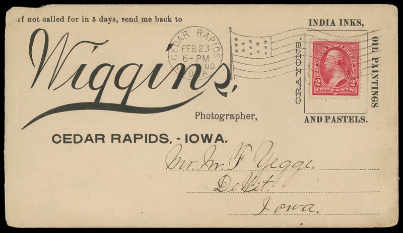 (Photography) "Wiggins, Photographer, Cedar Rapids, Iowa", large advertising corner card and advertising collar on cover bearing 2¢ carmine (279B) tied by "Cedar Rapids, Iowa Feb 23, 1900" flag machine cancel to DeWitt Iowa, with content, small corner flaw upper left still, Very Fine.