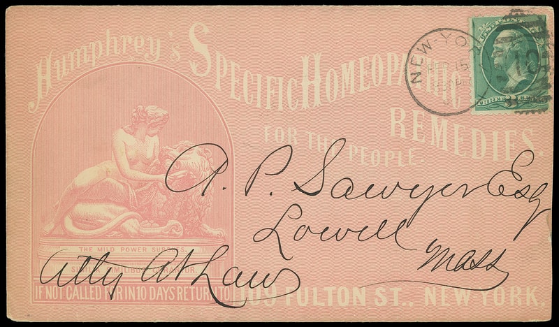 (Medical) Humphrey's Specific Homeopathic Remedies, New York N.Y., overall red illustrated advertising showing Woman caressing a Lion, on cover bearing 3¢ green (207) tied "New-York, Feb 15 '82" duplex to Lowell Mass.; reduced slightly at right, Very Fine and striking design.