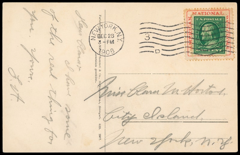 (Stamp Collars) American Red Cross, 1908 Christmas Seal, seal used as stamp ad collar on post card bearing 1¢ green (300) , hinged in place and tied by "New York, N.Y. Dec 28, 1908" machine cancel to City Island in New York City, Very Fine and quite unusual.