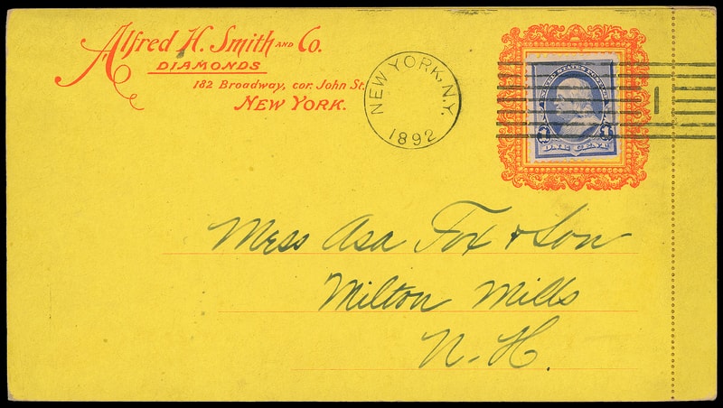 (Jewelry) Alfred H. Smith & Co. Diamonds, card lettersheet mailer with tab intact and fancy stamp frame bearing 1¢ blue (219) tied by dateless "New York, N.Y., 1892" machine cancel to Milton Mills N.H. Livermore & Knight imprint on reverse, Very Fine and early Livermore & Knight card.