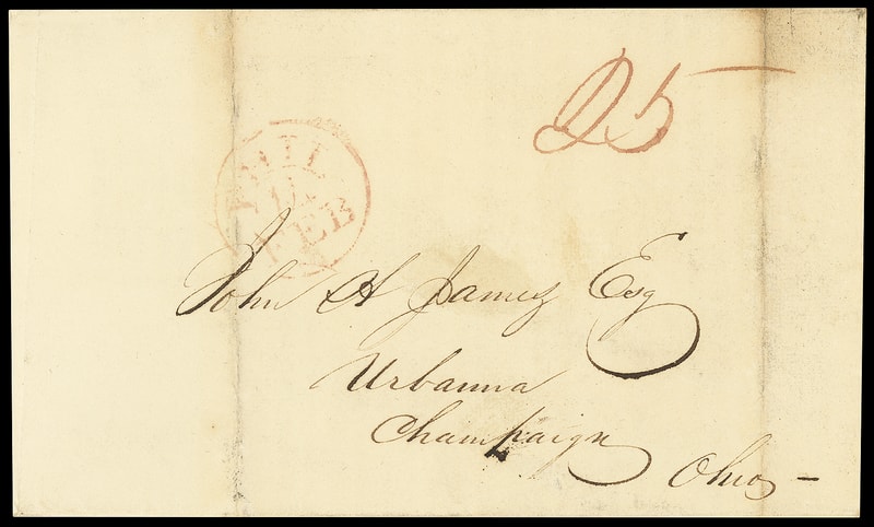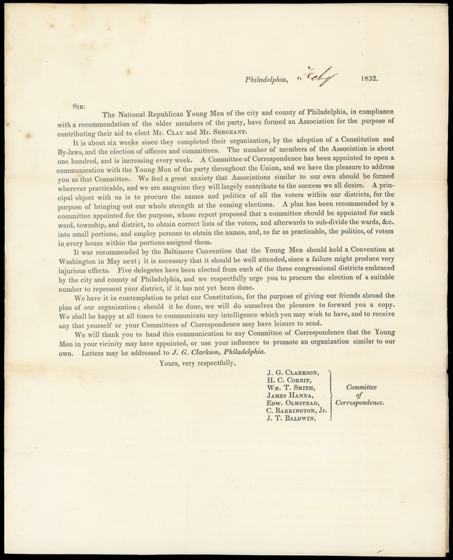 (1832 Campaign) Henry Clay, Important Printed Campaign Letter, printed circular from " National Republican Young Men of the City and County of Philadelphia…contributing their aid to elect Mr. Clay and Mr. Sergeant ", folded circular entered mails with red Philadelphia "Phil, 14 Feb" cds and ms. " 25 " cent rating to Urbana, Ohio; light file fold wear and soiling, Very Fine campaign circular.