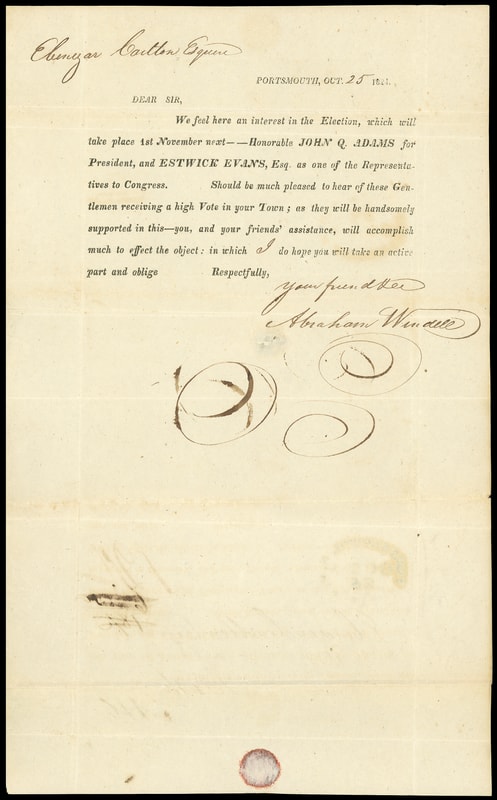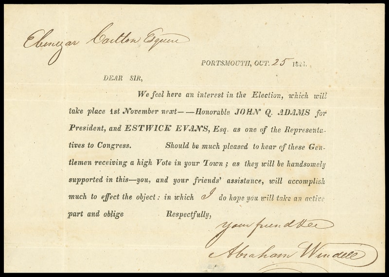 (1824 Campaign) John Q. Adams Campaign letter, printed letter datelined "Portsmouth, Oct. 25 1824" and reading " We feel here an interest in the Election, which will take place 1st November next -- Honorable JOHN Q. ADAMS for President, and ESTWICK EVANS, Esq as one of the Representatives to Congress. Should be much pleased to hear of these Gentlemen receiving a high Vote in your Town; as they will be handsomely supported in this town ", entered mails with rimless " Portsmouth N.H. Oct 25 " oval postmark and manuscript " 12½ " cent rating to Bath Me.; light fold toning across address, otherwise Very Fine, one of the earliest pieces of political campaigning .