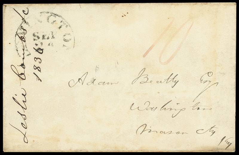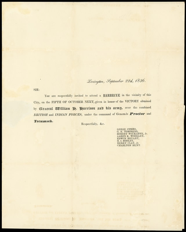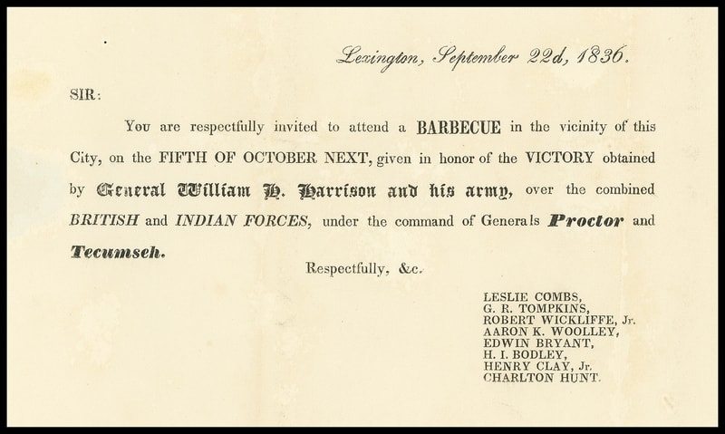 (1836 Campaign) William H. Harrison, printed Whig Political Meeting notice datelined "Lexington, September 22nd 1836" for a barbecue and celebration "given in honor of the Victory obtained by General William H. Harrison and his army, over the combined British and Indian Forces, under the command of Generals Proctor and Tecumseh", entered mails with "Washington Ky. Sep 26" cds and ms. "10" rating to Washington Ky., Very Fine and scarce 1836 campaign circular.