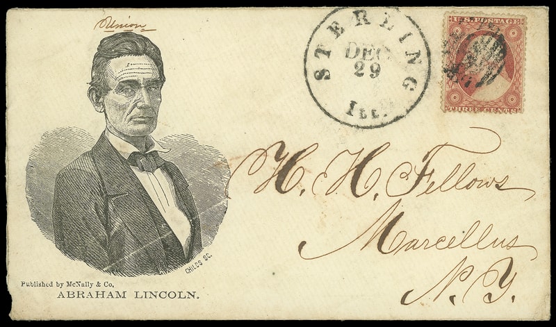 (1860 Campaign) Abraham Lincoln, beardless full-torso portrait design with McNally and Childs imprints, manuscript " Union " embellishment at top, on cover bearing 3¢ dull red (26) just tied by circular grid cancel duplexed with "Steling Ill. Dec 29" cds to Marcellus N.Y.; opened at left, Very Fine and scarce Lincoln campaign design.