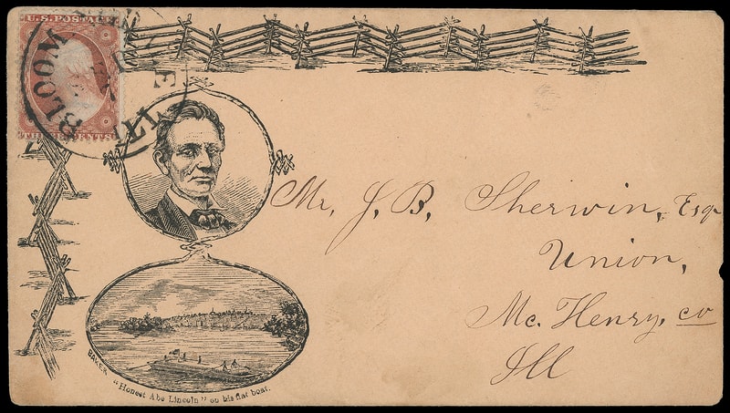 (1860 Campaign) Abraham Lincoln, portrait and railsplitter campaign design with additional flat boat scene, "Honest Abe Lincoln and his Flat Boat" caption and "Baker" imprint below, on buff cover bearing 3¢ dull red (26) tied by "Bloomingdale Ill. Sep 7" cds to Union Ill.; tiny nick at right, Very Fine and choice Lincoln Railsplitter design.