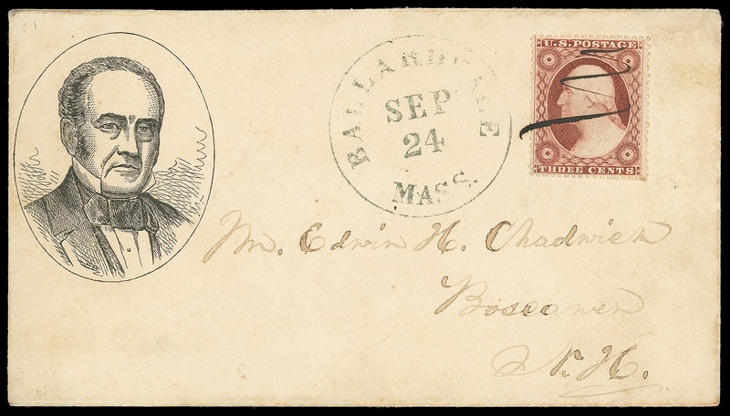 (1860 campaign) John Bell, large portrait facing left campaign design with "Bell" caption below on fresh cover bearing 3¢ dull red (26) tied by Ill. town to Philadelphia Pa.; mended cover tears along top, 3¢ torn, Very Fine appearance and rare campaign design, Chase note on reverse, ex-Bischel .