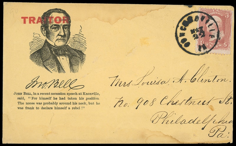 (1860 campaign) John Bell "Traitor", portrait facing right campaign design with bold red "Traitor" overprint, printed signature and verse below on yellow cover bearing 3¢ rose (65) tied by "Concordville Pa. May 22" cds to Philadelphia Pa.; light staining, reduced slightly at right, light staining at top, still, still Very Fine and exceptionally rare, only recorded used example , ex-Bischel .