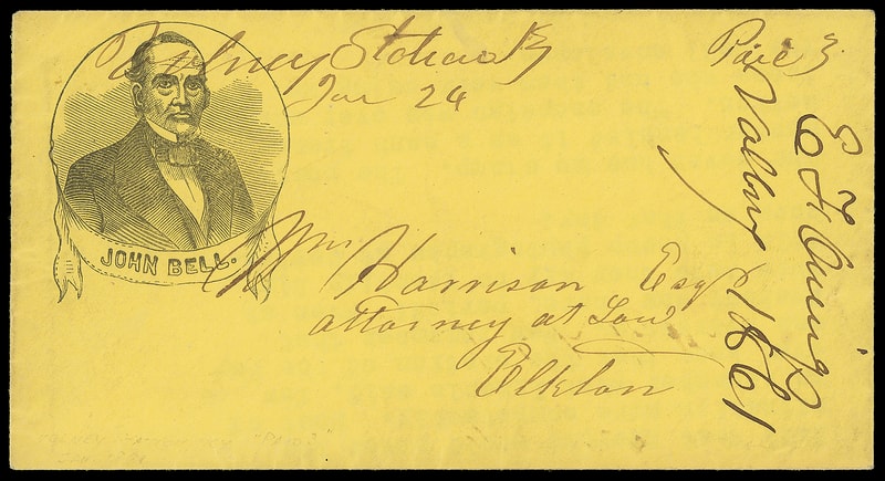 (1860 Campaign) John Bell, portrait facing right in oval campaign design on yellow cover with manuscript "" postmark and matching ms. "Paid 3" rating to Elkton, vertical 1861 docketing at right, Very Fine.