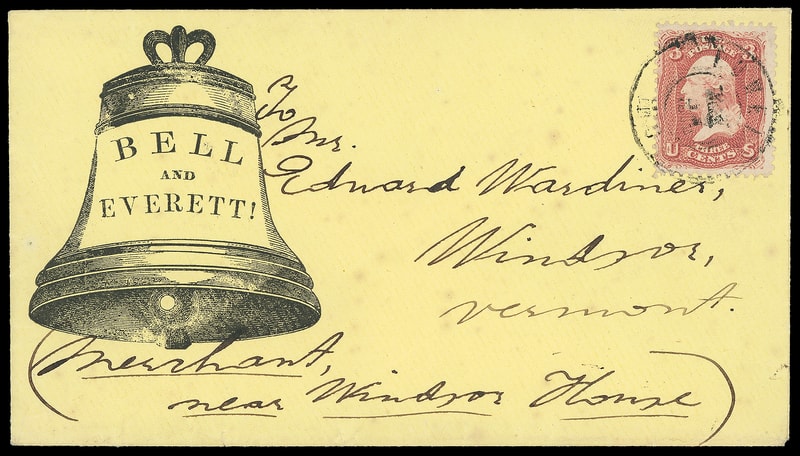 (1860 Campaign) John Bell, large illustrated "Bell and Everett!" Liberty Bell campaign design on fresh yellow cover bearing 3¢ rose (65) tied by "Lowell Ms. May 17, 1862" cds to Windsor Vt.; flap torn, Extremely Fine and choice, only two recorded used examples .