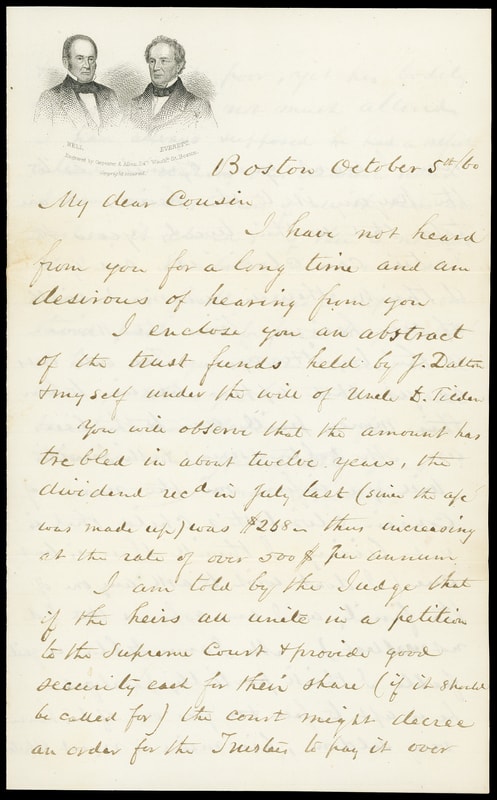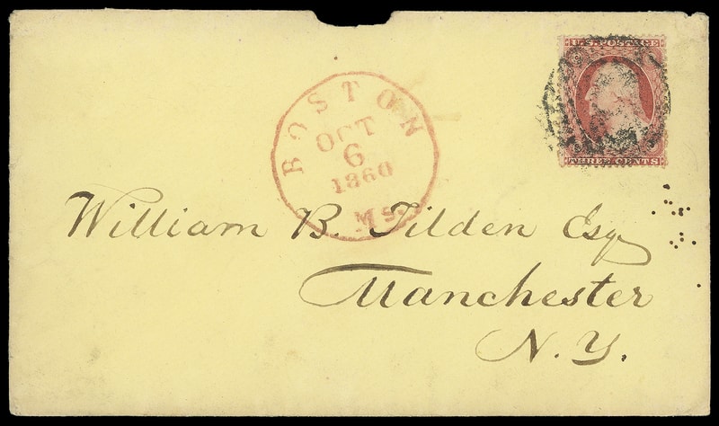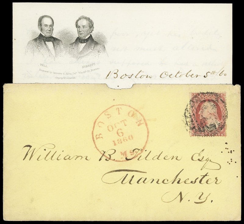 (1860 Campaign) John Bell Lettersheet, small campaign design lettersheet with engraved portraits of Bell and Everett with "Carpenter & Allen" imprint below on letter datelined "Oct 5th/60", with original yellow cover bearing 3¢ dull red (26) tied by large "Paid" circular grid, red "Boston, Mass. Oct 6, 1860" cds to Manchester N.Y.; cover nicked at top and partial backflap, Very Fine lettersheet.