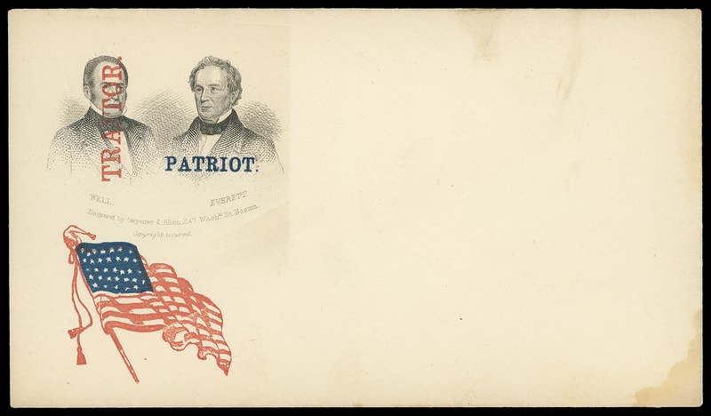 (1860 Campaign) John Bell, Edward Everett, 11 mostly different unused covers and one unused lettersheet, most with overprints "Traitor" (Bell) and "Patriot" (Everett), includes JBL6-9, JBL-11, JBL-14 (used, no markings), JBL-17, JBL-18 + 2 variations, F.-V.F. group, most unknown used, nice group.