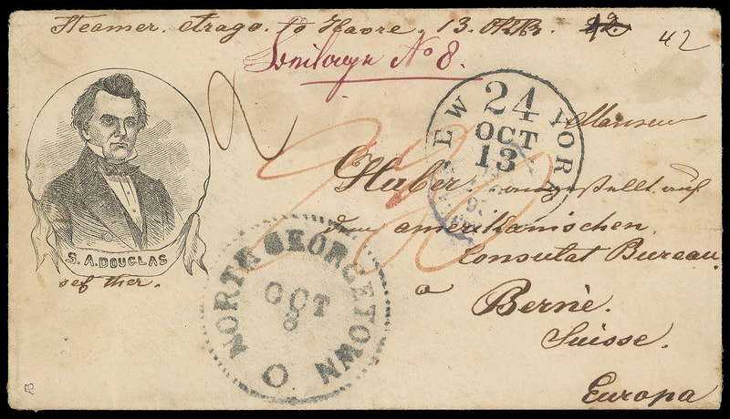 (1860 Campaign) Stephen A. Douglas, oval portrait campaign design with "S.A. Douglas" caption on 1860 cover with fancy "North Georgetown, O. Oct 3" balloon dotted-rim cds and small ms. "42" rating to Berne, Switzerland , black "New York '24' Oct 13" integral-debit exchange cds, French transit cds with "2" rating, Bern (10.28) arrival backstamp with red ms. "230" rappen due rating; top left edge tear, faint soiling mostly on reverse, flap torn, some soiling mostly restricted to back, Very Fine.