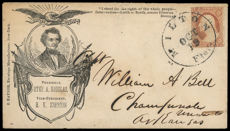 A RARE STEPHEN DOUGLAS 1860 CAMPAIGN DESIGN USED TO A FOREIGN DESTINATION.Lot 174