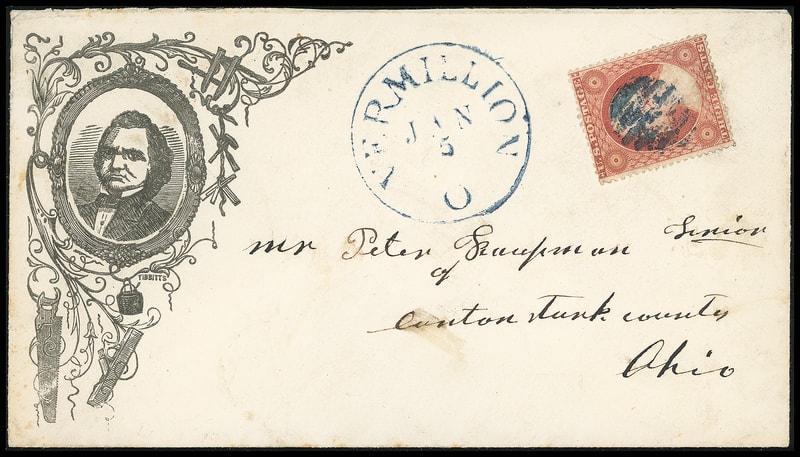 (1860 Campaign) Stephen A. Douglas, oval portrait in ornate frame campaign design on cover bearing well centered 3¢ dull red (26) canceled by blue grid cancel, matching "Vermilion O. Jan 5" cds to Canton, Ohio, exceptionally attractive, Extremely Fine and choice.