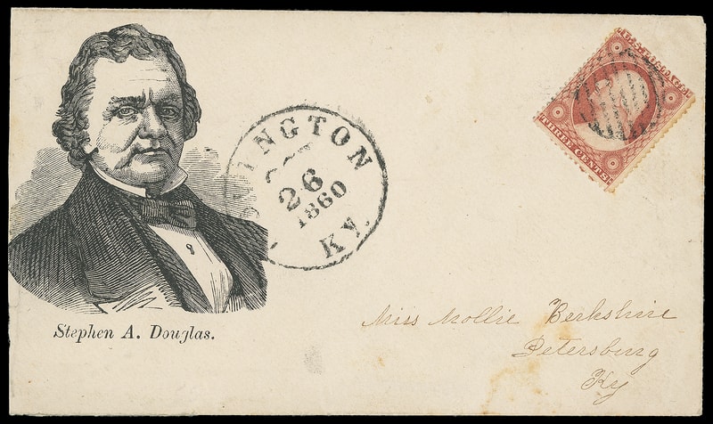 (1860 Campaign) Stephen A. Douglas, large portrait facing right campaign design with "Stephen A. Douglas" italic caption on cover bearing 3¢ dull red (26) canceled by grid, matching "Covington Ky. Oct 26, 1860" cds to Petersburg Ky.; reduced slightly at left with tiny tear, otherwise Very Fine and rare design.